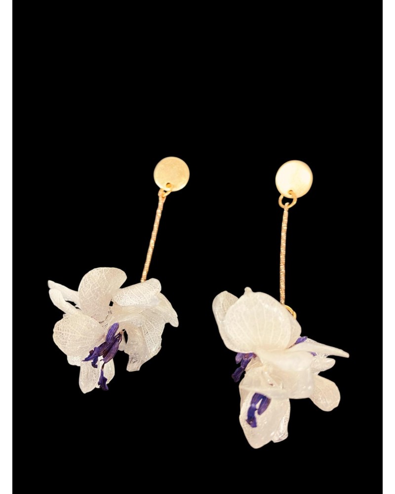 Los pendientes Loletta – Línea Impronta de la colección Oro d’Inverno son una joya artesanal que captura la delicadeza de la naturaleza. Elaborados a mano con flores preservadas de hortensia blanca y lavanda, se encapsulan en resina cristalina para conservar toda su belleza.