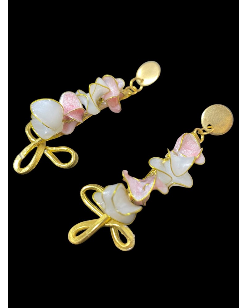 Elegancia natural y ligereza en una joya artesanal. Estos pendientes Loletta están elaborados cuidadosamente hoja por hoja en resina, montadas sobre una delicada base de latón en forma de hoja. Su diseño combina tonos blanco y rosa perlado, aportando un brillo sutil y femenino perfecto para cualquier ocasión.