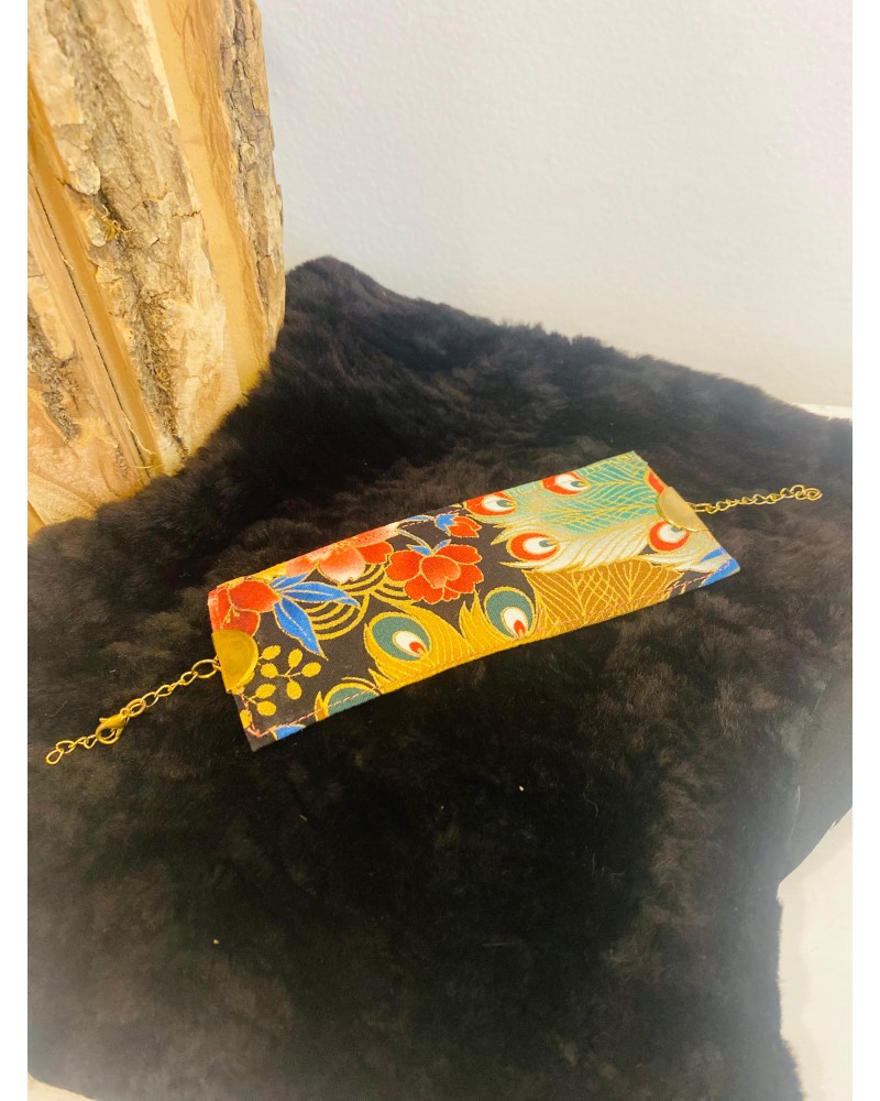 Pulsera artesanal hecha a mano con tela estampada que juega con contrastes vibrantes. Su diseño rectangular, acompañado de cierres metálicos, combina comodidad y estilo en una pieza ligera y fácil de llevar. Perfecta para añadir un toque de color y sofisticación a tu look diario.