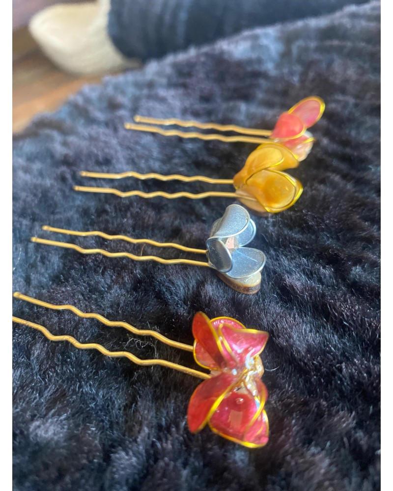 Cada aguja está rematada con una delicada flor de resina, hecha a mano, que aporta luminosidad y encanto a tu recogido.