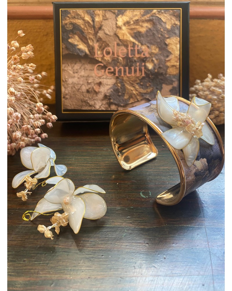 La Pulsera Boisée II combina la fuerza del latón dorado con la sutileza de flores modeladas en resina, inspiradas en los pétalos del ajo silvestre del bosque de Montserrat.