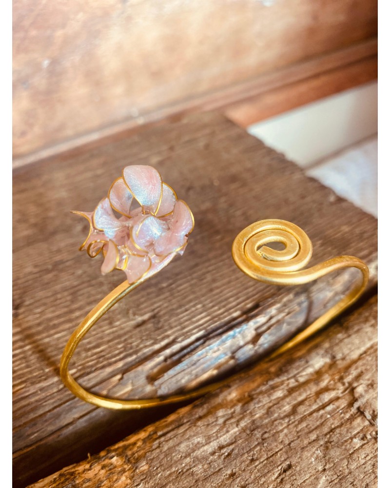 Pulsera abierta de latón dorado con flor artesanal de pétalos nacarados en suaves tonos rosados, modelados y perfilados a mano para crear una composición ligera y etérea. Su acabado irisado capta la luz con sutileza, aportando un brillo delicado y envolvente.